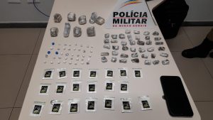 O suspeito recebeu voz de apreensão em flagrante e foi encaminhado para à delegacia. Os materiais apreendidos foram um aparelho celular, 39 buchas e 9 peças de matéria parecida com maconha, 40 pedras de substância análoga ao crack e 20 papelotes com matéria análoga à cocaína. As informações são da comunicação da PM.