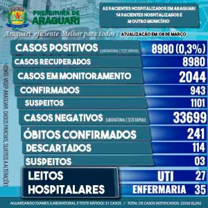 Os dados atuais apontam 8.980 casos positivos para Covid-19, 2.044 em monitoramento, sendo 943 confirmados e 1.101 suspeitos. Há 241 óbitos causados pela doença registrados, e mais três suspeitos. No que diz respeito à ocupação dos leitos de UTI, são 27 pacientes na Santa Casa de Misericórdia, representando 90% de sua ocupação máxima. Ainda, estão ocupados 13 (52%) leitos de enfermaria no Hospital de Campanha, sete (116%) na Unidade de Pronto Atendimento (UPA), sete (116%) no Hospital São Sebastião, seis (50%) no Hospital Santo Antônio e dois na Santa Casa. As informações constam no último boletim epidemiológico municipal, divulgado pela prefeitura nesta segunda, 8.
