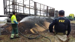 Veículo com 50 toneladas de soja pega fogo após estouro de pneu