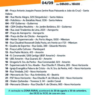 Locais de vacinação para este sábado, 4 de setembro, das 8h às 16h:
