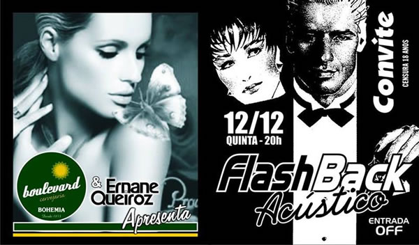 Para quem ainda não tem opção para a noite de hoje, vai uma bela dica. A tradicional Flash Back, comandada por Ernane Queiroz, ganhou roupa nova e chega em versão acústica para animar a quinta-feira, quase sexta. Será no Boulevard, a partir das 20h e a entrada é off.